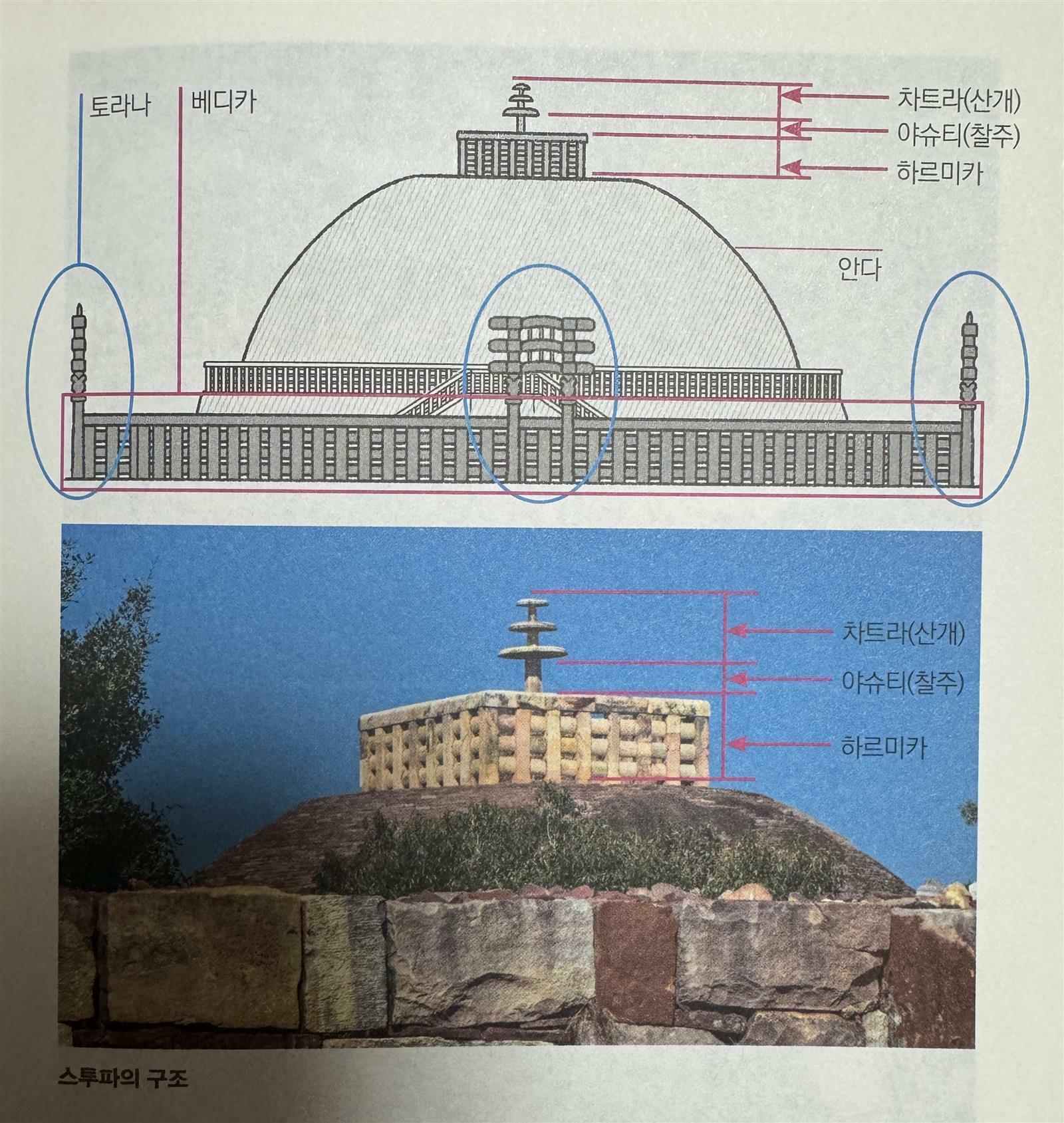스투파는 차트라(산개), 야슈티(찰주), 하르미카, 안다(복발), 토라나(문), 베디카(외곽 울타리)로 구성된다. 복발의 둥근 형태는 알을 뜻하며 생명의 순환을 의미하는 것이라고.